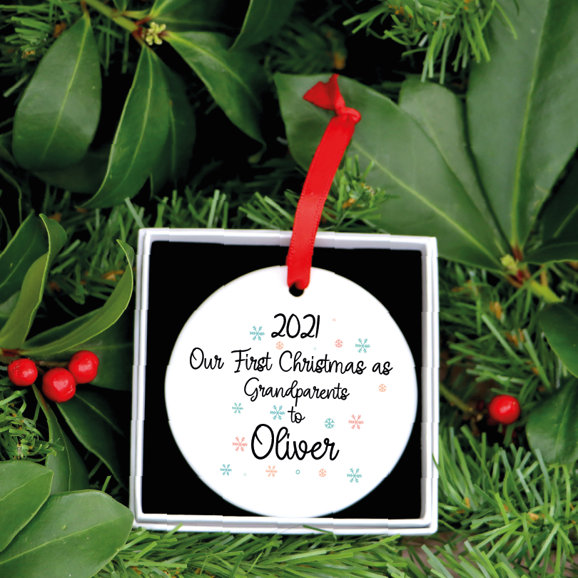 Our personalized 1st Christmas as Grandparents ceramic ornament is perfect for all new grandparents to hang on the Christmas tree! This ornament is personalized with your baby's name and year. You can change the title - if you want a different title, please let us know and we will change it for you.